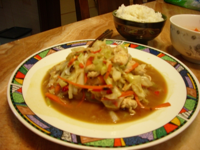 材料: 高麗菜1/6顆切絲,紅蘿蔔(半根)去皮切絲,半包雞柳切細條,