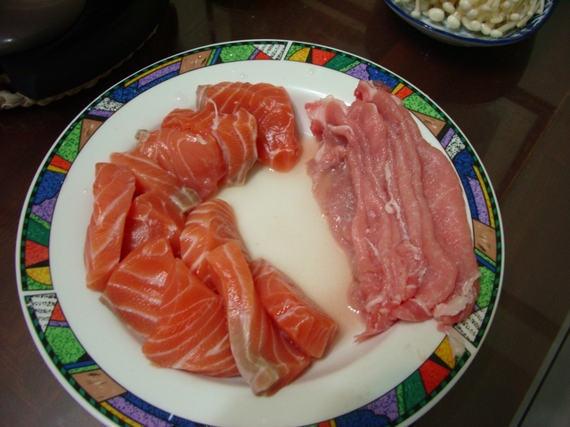 自己又加料 台糖的火鍋豬里肌肉片 和現流鮭魚切片