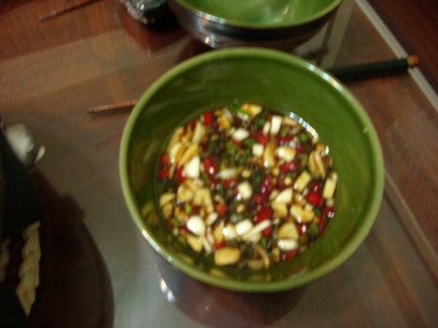 用蔥末,蒜末,辣椒末混合醬油和味霖(2:1)還有少許香油 糖將就著用