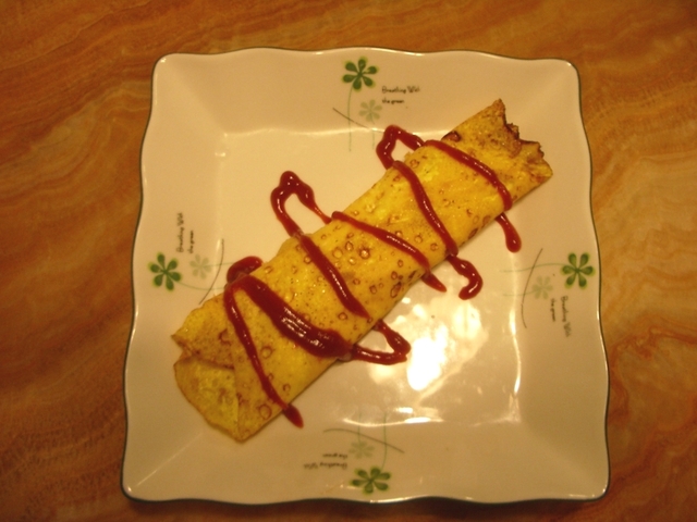 因為試作舒芙蕾,(有成功再PO囉!!!) 所以剩下了四個蛋黃, 就拿來做黃金蛋捲囉~(不是偷懶喔!!!) 蛋黃打散後, 加入一點海鹽和胡椒粉, 熱鍋後不加油, 倒入蛋黃搖均平鋪整個平底鍋, 周圍有焦黃顏色就熄火, 從邊緣捲入~ 放在盤子上擠上蕃茄醬就完成囉!!!