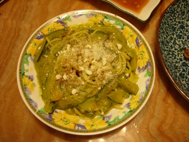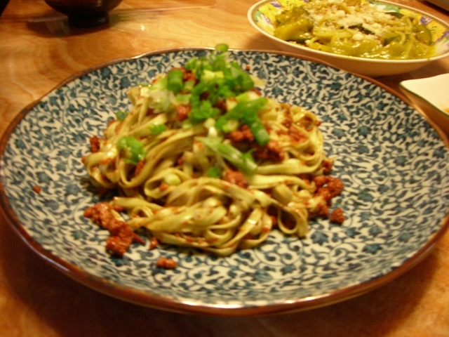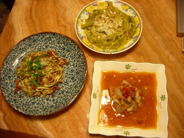 材料: 義大利細麵, 肉醬2/3罐, 蒜末, 蔥, 胡椒, 鹽少許