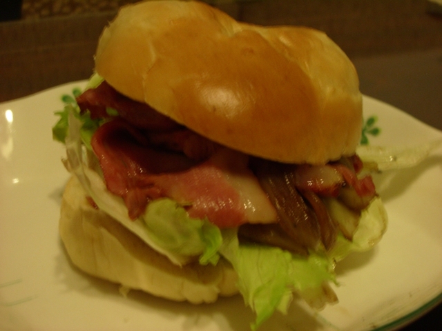 把昨天烤的貝果切開來, 以平底鍋煎了培根,
