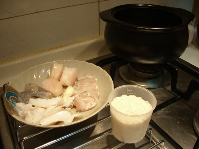 4. 將拌炒後的白米,川燙過海鮮料的雞高湯倒入陶鍋內燉煮,