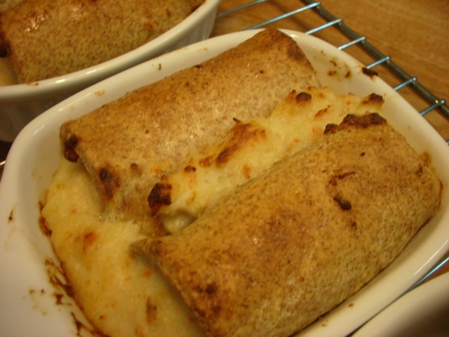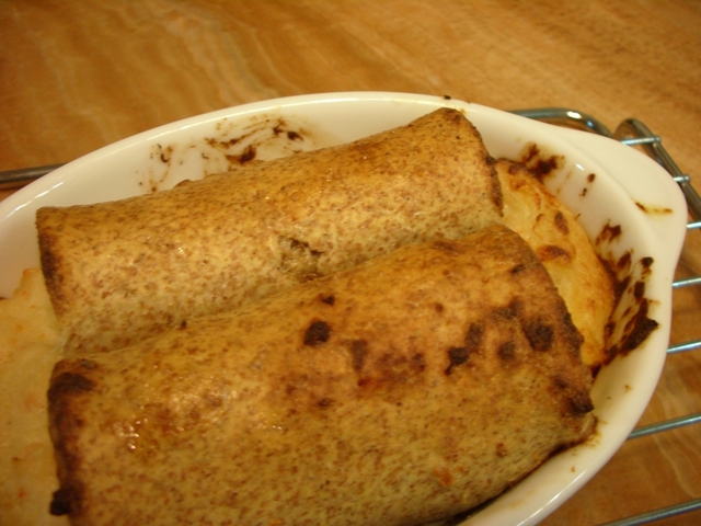 4. 每個麵皮放2大匙的醬料,捲起成麵捲,