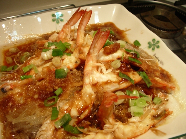 4. 將白蝦擺在冬粉上,淋上蒜泥醬放入鍋內蒸3分鐘,