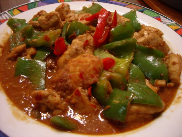 再把青椒雞肉放入拌炒至醬汁略微收乾,