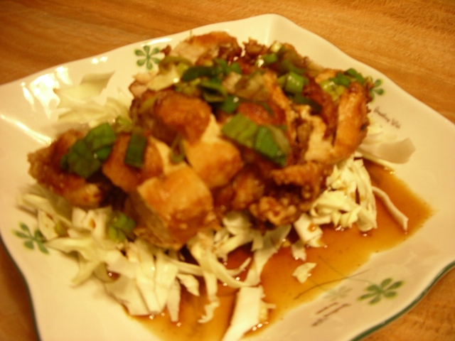 將火調高逼油就可以撈起瀝乾切塊擺在高麗菜絲上,