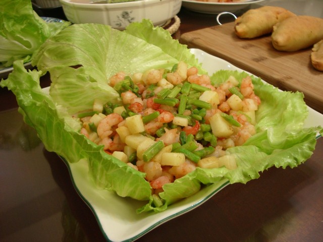 材料: 馬鈴薯一顆,蘆筍一把,蝦仁,鹽,胡椒,米酒