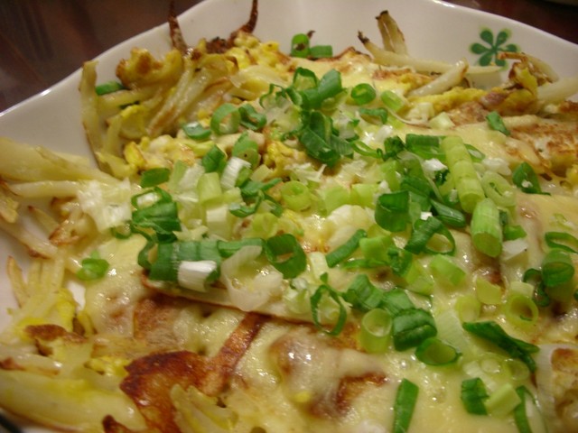 馬鈴薯是Rakesh的好朋友, 每回去賣場總是順手帶幾顆回來, 不用放進冰箱就可以擺上一陣子, 能夠做的料理也不少!!! 有天晚上肚子忽然餓了, 就隨手削了一顆馬鈴薯切絲, 用奶油稍微煎過再淋上一顆蛋, 等蛋稍微凝固,灑上起司絲和少許蔥花放進烤箱烤五分鐘就可以吃宵夜了