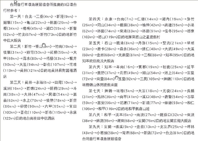 放長假已經無望了!! 只好改變執行計畫II:單車環島 參考了前人的經驗: 目前的計畫如下: DAY1: 新竹->彰化 DAY2: 彰化->台南新市 DAY3: 台南新市->墾丁 DAY4: 墾丁->楓港->台東 DAY5: 台東->花蓮 DAY6: 花蓮->礁溪 DAY7: 礁溪->台北 DAY8: 台北->新竹