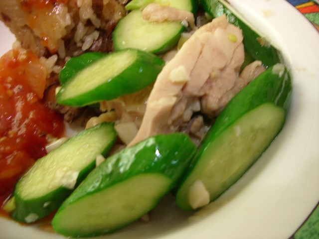 材料: 雞腿肉,小黃瓜,蒜頭,蔥花,胡麻油,胡椒,鹽,薑