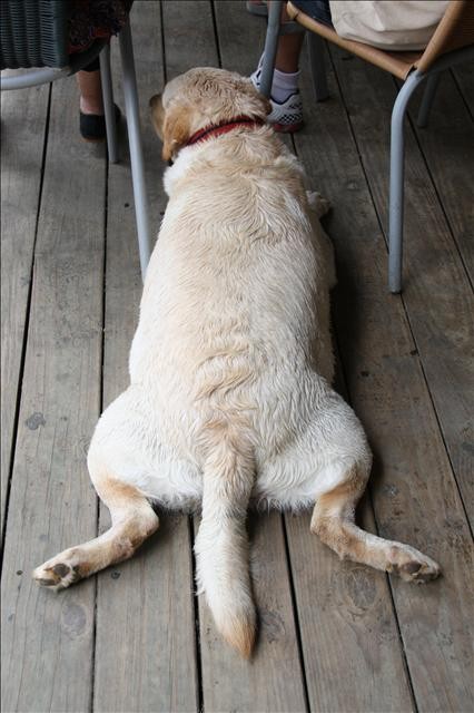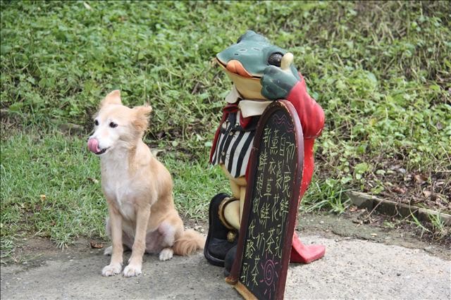 一進到初鹿牧場,馬上看到一隻很乖的狗,主人要求它坐好和吐舌的青蛙拍張照,