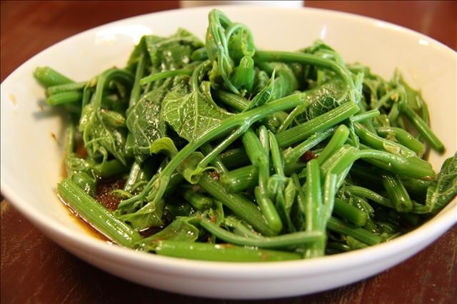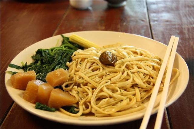 香椿拌麵附上了煮蘿蔔和地瓜葉,還有一顆酸梅!