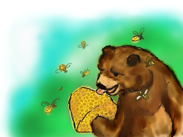 熊先生心想著"真幸運,可以有隻長著蜂窩的手掌!