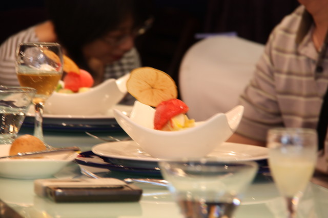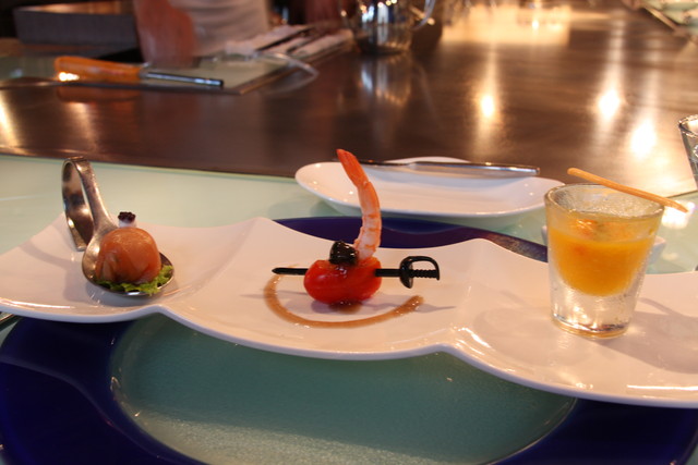 這道冷盤由右到左分別是芒果莎莎,松露鮮蝦番茄和鮭魚沙拉,