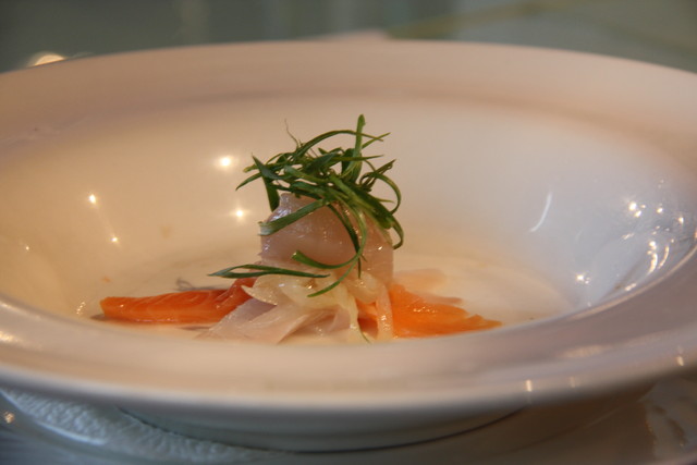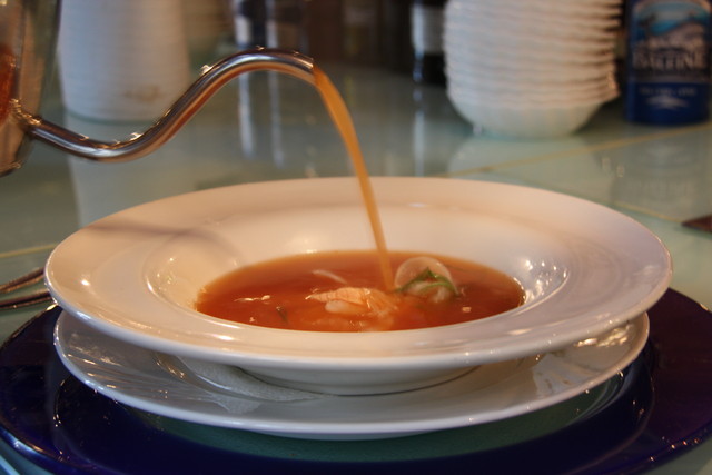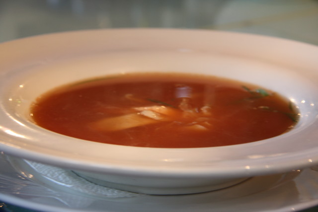 朋友點的番茄海鮮湯是以鮭魚薄片和花枝軟絲襯底放上生干貝和青蔥絲~