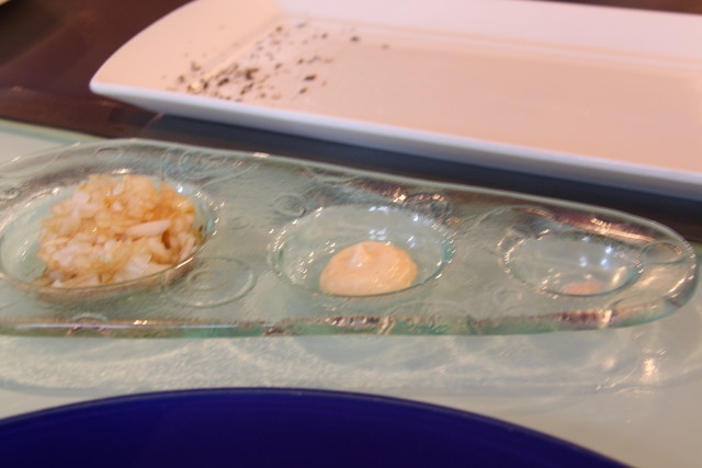 三種沾醬洋蔥碎,蛋奶醬和給得寒酸的玫瑰鹽,