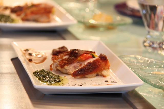 先將雞皮煎到酥後再翻面煎,不過主廚切開後才發 現裡面夾了蔬果!