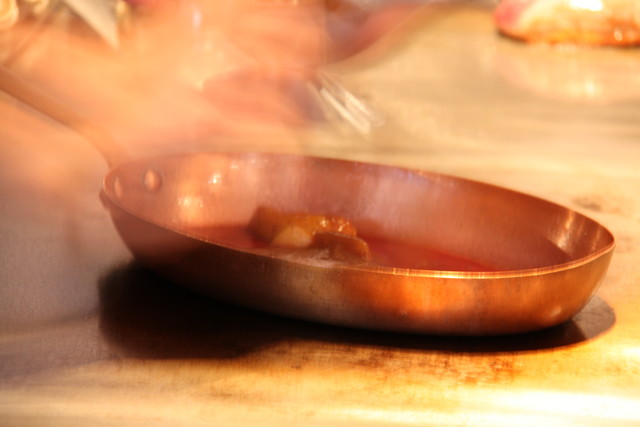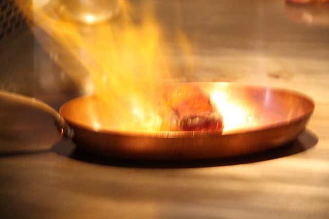 玫瑰色的鴨胸也是先把表皮煎酥,放在銅盤上,淋上白蘭地,點火燃燒,