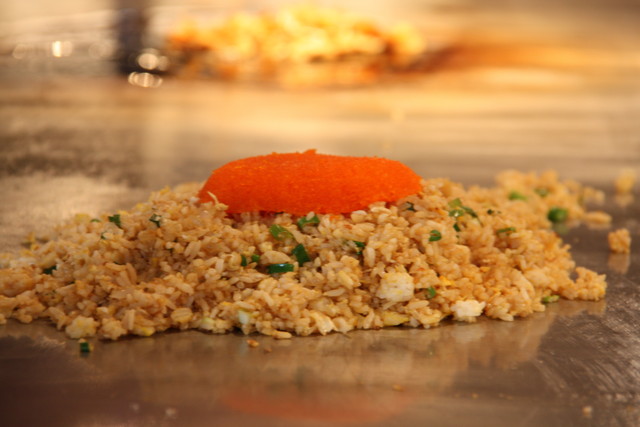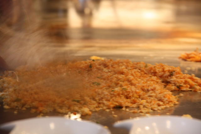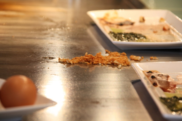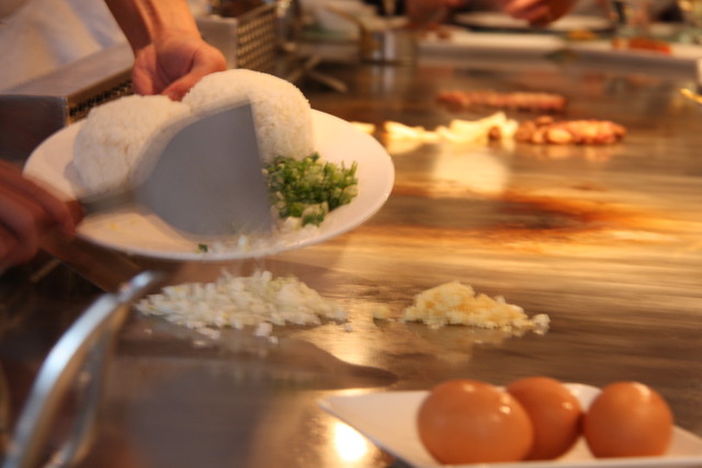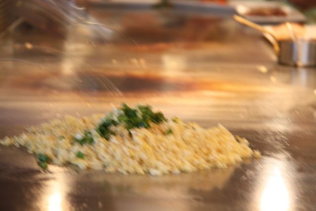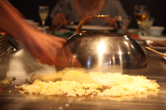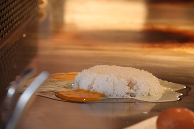 2.接著主廚在低溫的鐵板上打上了三顆蛋,放上兩碗白飯拌均勻!(這和Rakesh炒黃金炒飯的做法雷同!)