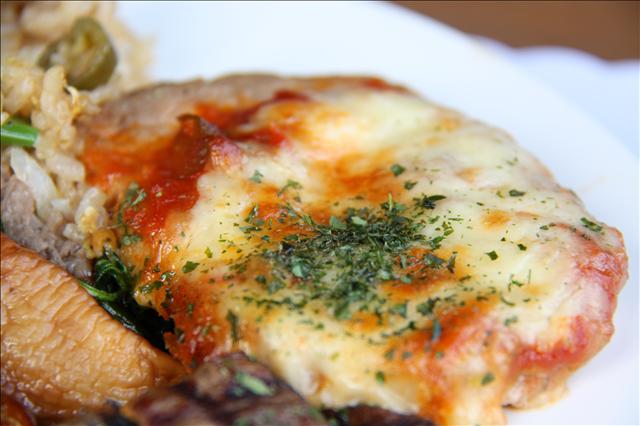 起司豬排,豬排煎過後放上起司茄醬再灑上香菜末,味道不錯!