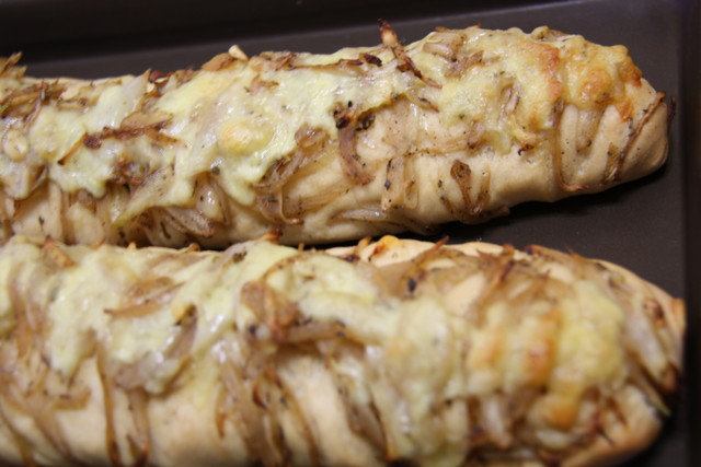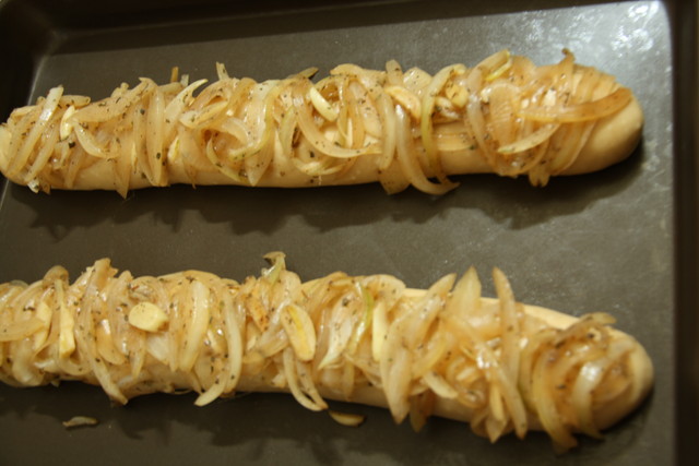 - 將發酵的麵團分成2~4份整成法國麵包的樣子,放在灑了麵粉的烤盤上,鋪上洋蔥料做第二次發酵一小時,