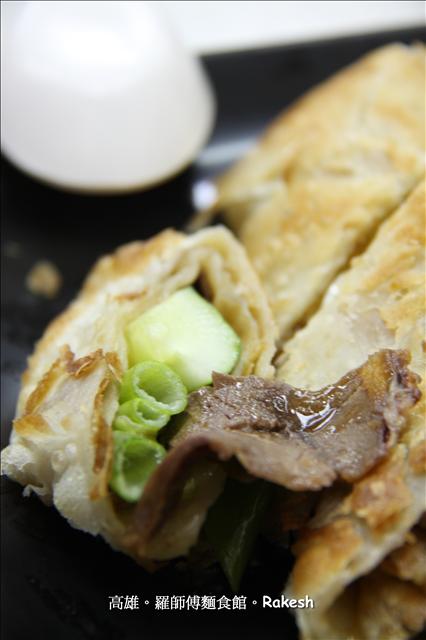 牛肉捲餅,餅皮煎得金黃酥脆,裡面夾了滷牛腱肉,小黃瓜和蔥段,