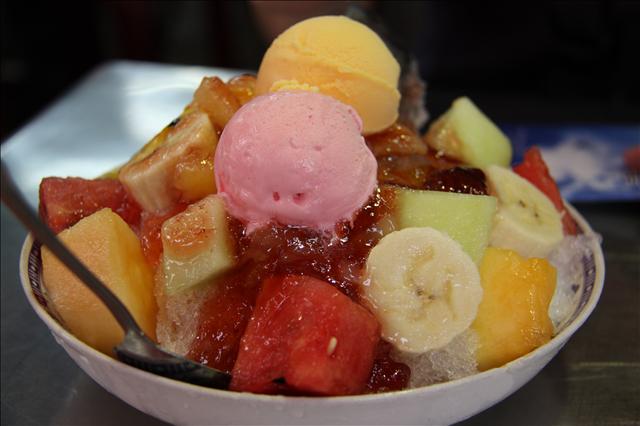 點了综合水果冰,剉冰上面放了不少得水果,淋上草莓果醬和兩球冰淇淋,