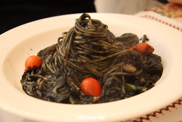 墨魚義大利麵,以義大利麵條裹上墨魚醬汁煮成,