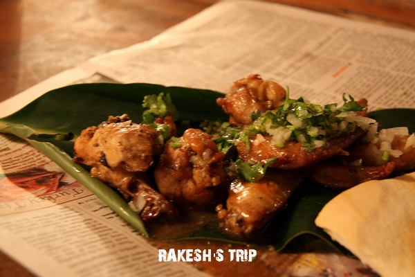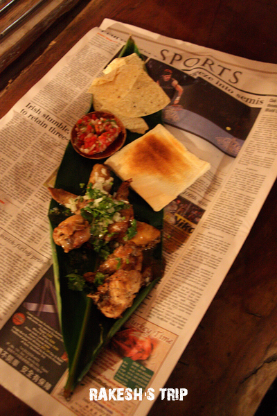 Rakesh這次點了酸辣雞翅,擺放在葉子上還附上烤土司,玉米片和莎莎醬,