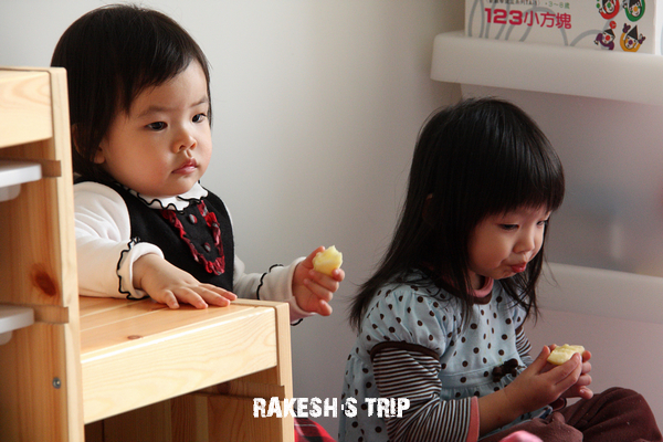 好不容易小朋友終於在遊戲間坐下來吃起水果,