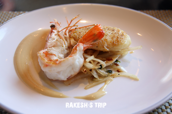 接著,上了海鮮盤,和風洋蔥上擺上了鮮蝦和鮮魚片,旁邊還附上芥茉沙拉醬,