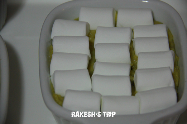 2. 加入葡萄乾攪拌均勻後放在烤皿中,將綿花糖切半鋪在上面