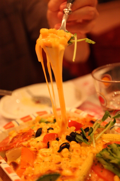 焗烤蔬菜可以拉得超長的起司絲味道還不差!