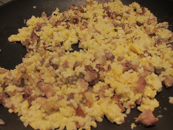 2. 兩顆蛋打散,直接拌在飯裡